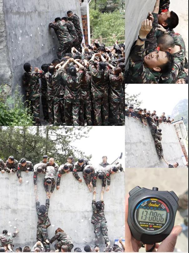 4、畢業墻——每個人都要翻越一堵4.2米且垂直的圍墻。這又是一個必須依靠集體的力量才能完成的項目。剛開始,大家都認為這是很難完成而且比較危險的任務,估計需要半個小時,甚至一個小時才能全部通過。我們先選出一個領導人來指揮、策劃,我們采用“疊人墻”的方法,讓身強力壯的同事們在下面做底座,大家奮力將他們先托上高墻,然后他們在上面接應,其他同伴踩著底座同伴的肩膀,一個一個成功地翻越了高墻。整個過程66人歷時13分零8秒,這樣驚人的成績是我們意想不到的,真的非常感謝在這個項目中讓我們踩著腿、踩著肩膀、拉我們上去的戰友們,踩到您的身上真的不忍心下腳,真的是踩在您的身上疼在我的心上,為了團隊的勝利沒辦法,必須要踩上去,多猶豫一分鐘您就多受累一分鐘。我是女生中第一個上去的,慌忙中記不清是踩在誰的腿上、肩膀上、拉我上去的面孔,總之,就是感恩、感激、感謝!真心感謝每一份默默辛勤付出的戰友們!正是有您的付出我們團隊才會順利“畢業”。這個項目讓我領悟到一個團隊要想成功必須有一個領導者,有為此默默付出團結一致的心才能成功。“人心齊、泰山移”,從古至今,團隊融合與凝聚都在企業的成長壯大中起著非常重要的作用。積極的團隊士氣、目標、職業生涯規劃在組織內積累、傳播、充實、整合,不僅加強了團隊建設,提升企業形象,也可以更好的完善企業的性格,激活企業的生命力,可以說是企業動力的源泉,可以從根本上提升企業的綜合素質和競爭優勢。