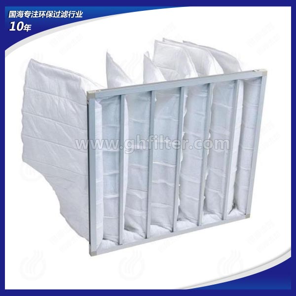 中央空調及通風系統前端通常會配有初效板式空氣過濾器與中效袋式空氣過濾器。初效板式空氣過濾器作為最前端的預過濾處理設備,主要過濾通風系統中5μm以上的粉塵粒子,而中效袋式空氣過濾器主要過濾通風系統中1-5μm的粉塵粒子懸浮物。中效袋式空氣過濾器與初效板式空氣過濾器在使用更換過程中有些相同,都在通風系統中具有阻力小,容塵量大,更換方便的特點,因此被很多行業所采用。袋式中效過濾器,可用于空調系統的中級過濾,以保護系統中下一級過濾器和系統本身,在對空氣凈化潔凈度要求不嚴格的場所,經中效過濾器處理后的空氣可直接送至用戶。鋁框袋式過濾器采用優質合成纖維或進口玻璃纖維為濾材,鋁合金型材外框,內部噴塑冷拔絲支撐架。國海袋式過濾器有效過濾面積大,容塵量大,阻力小,通風量大;框架及支撐架均可重復使用,更換過濾器時僅需更換過濾袋,且方便快捷,大大降低運行成本費用。廣泛應用于電子、制藥、醫療、食品等行業的過濾系統,是目前結構最好的中效過濾器。