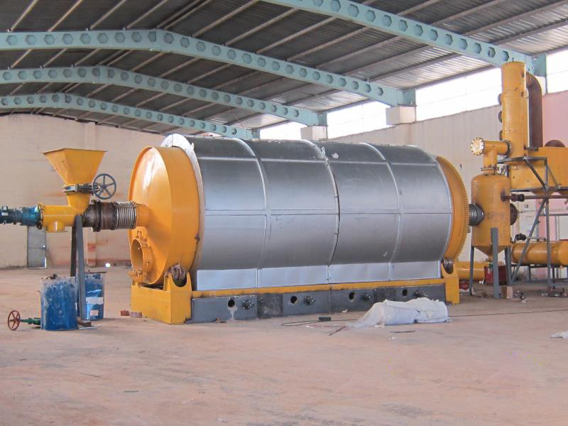 廢舊輪胎裂解煉油設備將廢輪胎破碎成裂解所需的橡膠塊,與低溫硫轉移催化劑一起通過進料機經熱氣密裝置連續送入裂解器,進行常壓低溫裂解裂化反應。